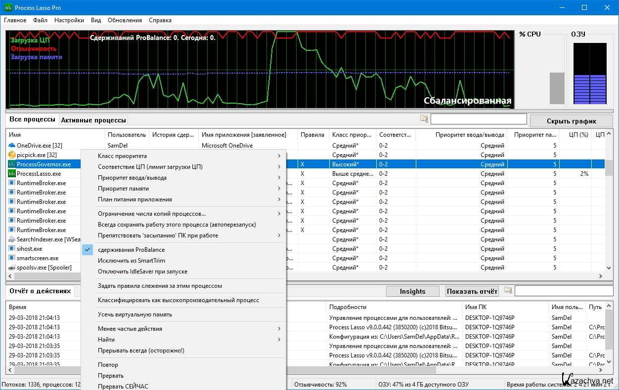 Process Lasso Pro - профессиональная версия небольшой утилиты, позволяющей вручную или автоматически манипулировать процессами, запущенными на вашем компьютере для достижения максимального быстродействия и стабильности. Эта утилита не является заменой стандартному менеджеру процессов, она, скорее, добавляет новые функции, которые позволяют оптимизировать работу ЦПУ при максимальной нагрузке. Программа дает возможность определить приоритет процессов, причем, по желанию пользователя приоритет будет задан и для всех последующих запусков.