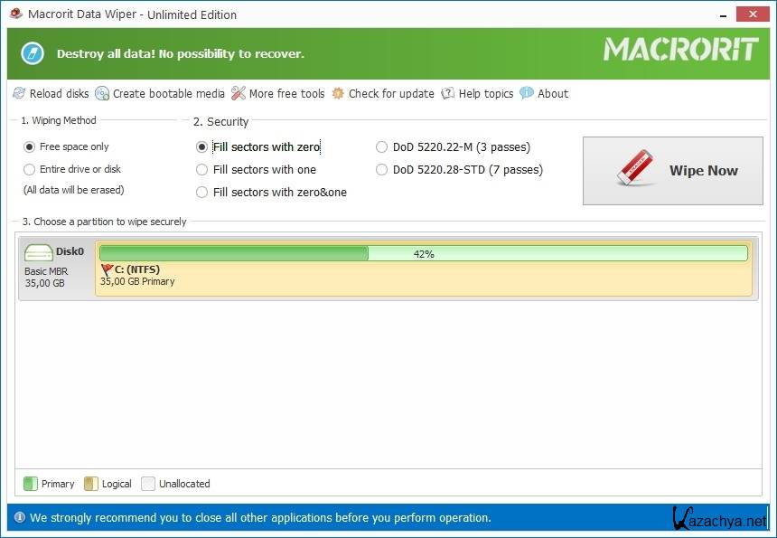 Macrorit Data Wiper - мощная утилита, которая поможет вам полностью очистить диск. Если вы хотите удалить данные с жесткого диска, форматирования или простого удаления недостаточно, чтобы защитить свои личные данные или корпоративные документы от восстановления. Вам нужен профессиональный инструмент по очистке диска, который полностью сотрет все данные диска или раздела. Мощные алгоритмы программы Macrorit Disk Partition Wiper обеспечивают простое в использовании решение для полного уничтожения данных без возможности восстановления.