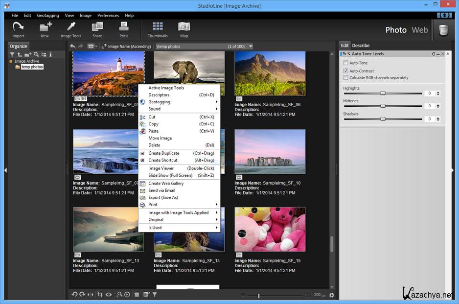 StudioLine Photo Basic - менеджер и редактор цифровых фотографий и других графических изображений. Упорядочивает фотоархив и редактирует параметры фотографий. Можно удалять эффекты красных глаз, можно изменять цвет тона, можно регулировать параметры яркости и так далее.
