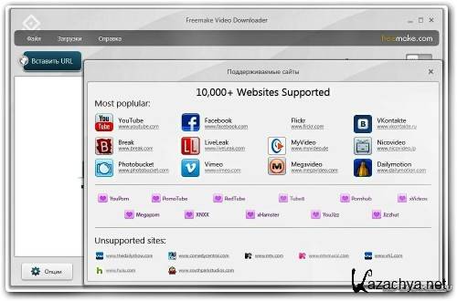 Freemake Video Downloader - бесплатный загрузчик видео, позволяющий без труда скачивать видеофайлы с таких видеохостингов, как ВКонтакте, Яндекс, RuTube, Mail.ru, YouTube, Facebook, Google Video, MetaCafe, Vimeo, MTV и многих других, сохраняя их в оригинальном формате или форматах AVI, MKV, MP3, iPod, iPhone, PSP, Android.