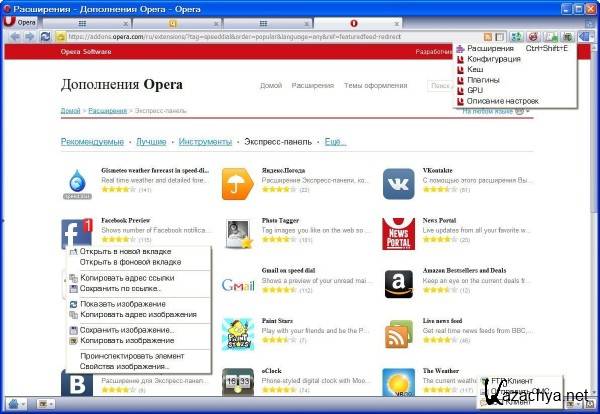 - Скрыть/Показать суб-панель расширений и управление расширениями + (Быстрый доступ к настройкам браузера + Кеш, Плагины, GPU, Описание настроек (opera:config), Adobe Flash Player