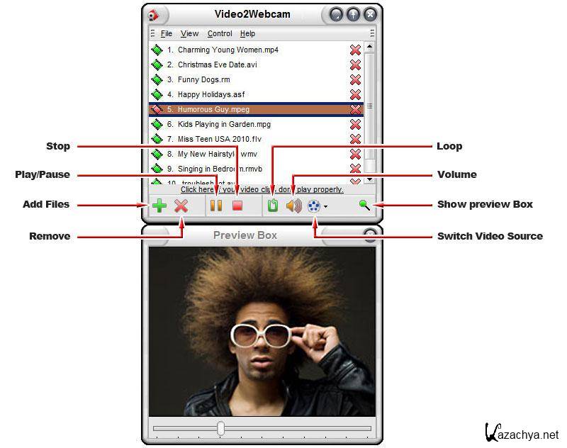 Video2webcam enables you to show video clips as virtual webcam during video chat whether you own a real webcam or not. You could either share your home-made video clips easily with your friends while chatting on line or make fun of them by pretending to be somebody else. With it, you can play a variety of videos on messengers and switch between real & virtual webcams easily & quickly.It supports all kinds of media file formats including video formats (avi, asf, flv, mp4,mpeg, mpg, ram, rm, rmvb, wmv and etc.) and picture formats (jpg, gif, bmp, png and etc.). Besides, it works on all webcam programs such as MSN, Camfrog, Skype, ICQ, AIM, Paltalk, Yahoo Messenger, ANYwebcam, Stickam, ICUII, Ustream.tv, iSpQ, etc.