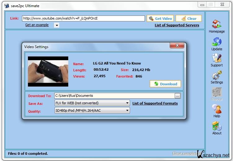 save2pc Ultimate - это простая в использовании программа, которая позволяет сохранять видео с известного файлового хранилища YouTube. При помощи YouTube Downloader можно загрузить любой видеофайл с веб-сервиса YouTube по приведенной на его страничке ссылке. Все, что требуется от юзера - это скопировать и вставить ссылку в окно save2pc Ultimate, выбрать нужный формат и запустить автоматическую загрузку / конвертирование видеофайла. Поддерживаются самые распространенные видео форматы (AVI, WMV, MOV, 3GP, MP4). Возможно сохранение не видеоролика, а лишь его звуковой дорожки в формате MP3.