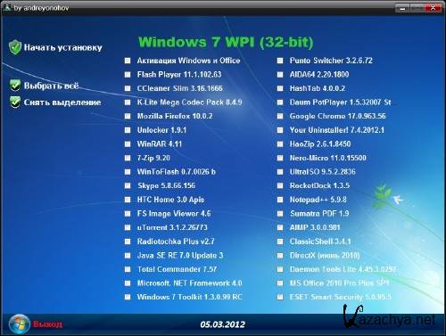 В сборке - представлены версии программ для операционных систем Windows 7 (32/64 Bit).Программы уже зарегистрированны и не требуют активации. Данный сборник будет полезен как начинающему, так и опытному пользователю. Имеется возможность выборочной установки Microsoft Office 2010 SP1. Обновлён список программ WPI от 05.03.2012г.