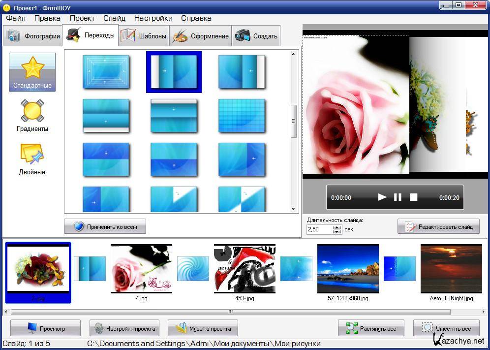 Десятки традиционных и оригинальных эффектов переходов придадут вашему слайд-шоу особую выразительность. Вы можете использовать как классические переходы, например, растворение, так и современные - перелистывание, свёртывание, звёзды...