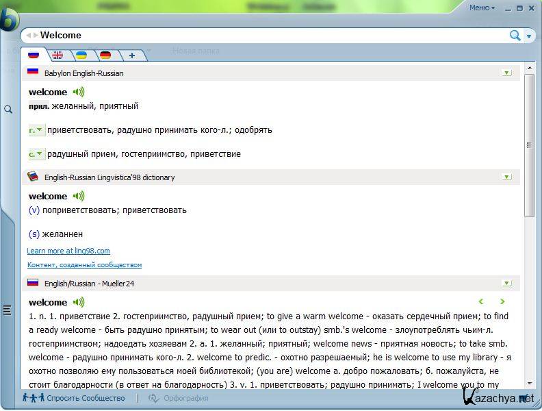 Англо-русско-английский и другие словари можно закачать дополнительно с сайта разработчика. Кроме словаря, который можно использовать в любое время, при онлайн-работе, Babylon позволяет воспользоваться огромными базами данных, сосредоточенными в таких глоссариях, как Britannica, Amazon, Accuweather и другие. Теперь вам не потребуется много времени на исправление орфографических ошибок и на поиск правильного слова или перевода. С данной программой читать и писать на всех языках гораздо проще, быстрее и эффективнее. Программа делает всю работу за вас, при помощи проверки орфографических ошибок в реальном времени, умного переводчика на любой язык и с любого языка, а также автоматического подбора выражений.