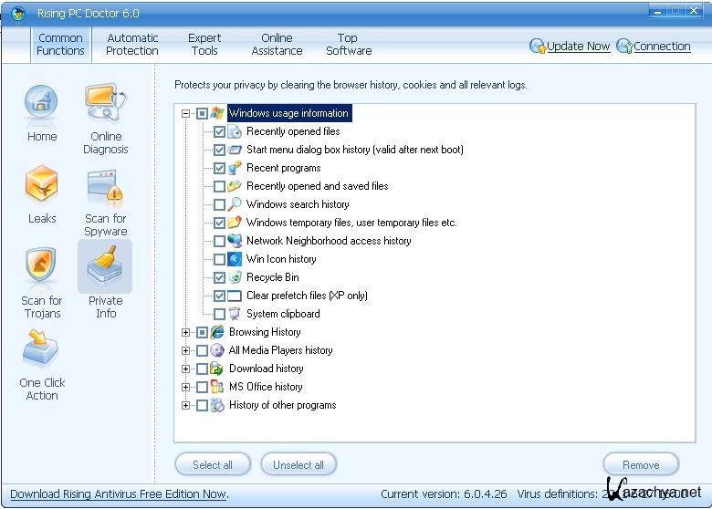 Rising PC Doctor protects your privacy. With Rising PC Doctor, even inexperienced users can conveniently delete potentially sensitive information such as browser and media player history or the list of last files opened under Microsoft Office.