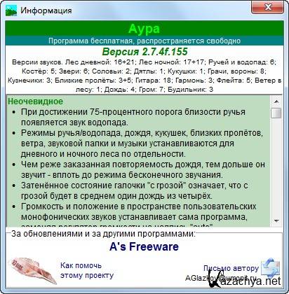 "Аура" — блестящая программа, которая создает на вашем компьютере потрясаюшую звуковую атмосферу дневного и ночного леса. Достаточно одного щелчка по значку, чтобы выключить или включить воспроизведение. Пульт управления, вызываемый правым кликом по значку, позволяет настроить активность птиц, цикад, ручья, водопада, дождя, грома, костра, зверей, флейты, гитары, скрипки, виолончели, назначить автоматическую смену аур (с заданной периодичностью или в соответствии с временем суток), задать автоматический старт программы при включении ПК, выбрать автоматическое выключение компьютера в заданное время (для любителей засыпать под умиротворяющие звуки леса).