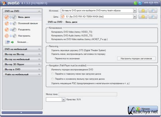 Копировать на чистый DVD диск любого формата(DVD+R/RW, DVD-R/RW, DVD+R DL, DVD-R DL).