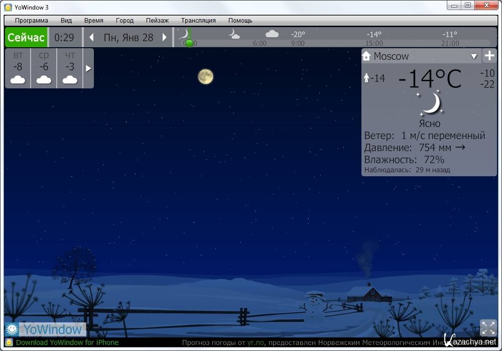 В настройках YoWindow можно включить программу в автозапуск, выбрать для отображения информационные панели (интерактивная временная шкала, панель прогноза, инспектор, активировать анимацию погодной картины). Если нас интересует не только температура воздуха, то на экран следует вывести информацию о диапазоне температуры (какая она есть и какая она по ощущению), картинке неба, ветре, давлении, влажности, количестве осадков, видимости, времени восхода и заката, долготе дня и фазе луны. Также настраивается количество дней для отображения прогнозов, пейзаж (по умолчанию это “Деревня”), единицы измерения (фаренгейты, цельсии, мили, метры, узлы и прочее). Как только мы уйдем от компьютера и пройдет считанное количество минут, автоматически включится скринсейвер и на экране снова будет валить снег. И даже если на дворе конец марта, все равно YoWindow обрадует нас своей волшебной картинкой.