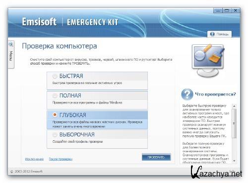 Emsisoft Emergency Kit содержит набор бесплатных программ, которые могут быть использованы без установки для сканирования и лечения зараженного компьютера от вредоносных программ:вирусов, троянов, интернет-червей, шпионского и рекламного ПО.