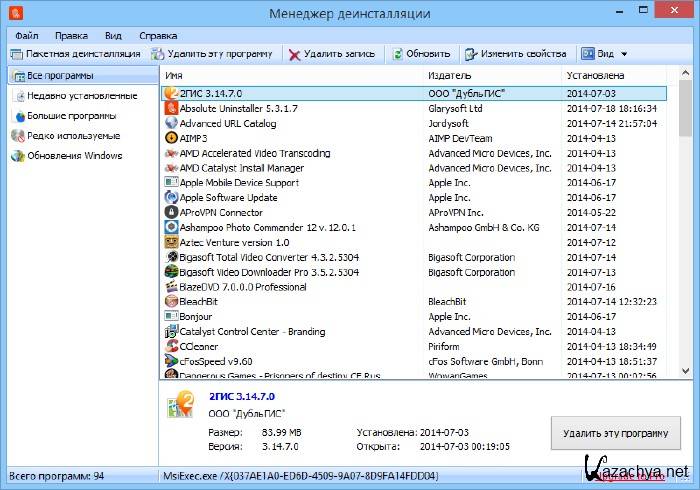 Absolute Uninstaller похож на стандартный Windows Добавить / Удалить программу, но более расширен функционально. Uninstall Manager может стереть все мусорные файлы буквально за несколько секунд, его технология удаления предлагает более удобный способ удаления ненужных приложений и повысить эффективность компьютера. Полностью удалить: связанные иконки рабочего стола, меню «Пуск», записи и ключи в реестре.