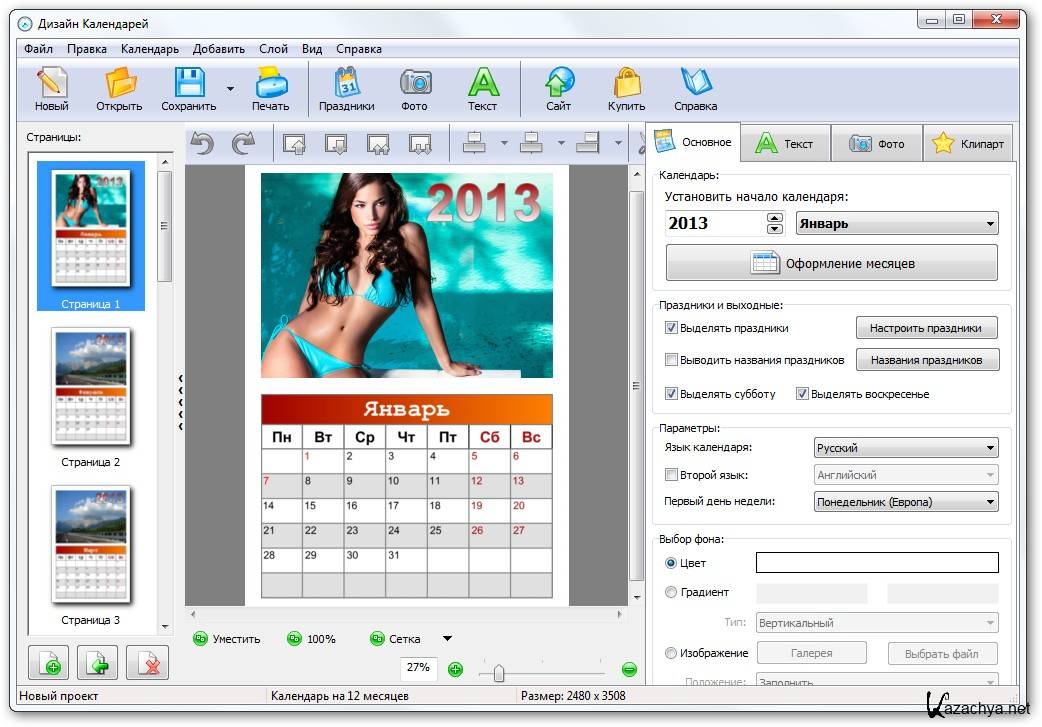 Вы сможете создавать самые разнообразные календари: карманные, настенные, настольные; на целый год, квартал или на один месяц. Выбирайте любой формат листа, композицию и стиль оформления. Поддерживаются многостраничные календари.