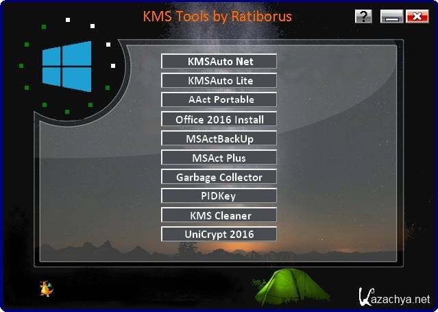 KMS Tools - сборник активаторов от Ratiborus в одной оболочке для Windows XP, Vista, 7, 8, 8.1, 10, Server 2008, 2008 R2, 2012, 2012 R2, Office 2010/2013/2016. Выбираем нужную и сразу можно пользоваться, никакой установки, все полностью портативно. К каждой программе прилагается описание на русском языке. Если есть вопросы по программе, не знаете зачем она нужна, нажимаем справа на вопросик и видим значки рядом с названиями ПО, нажимаем на них и получаем полную информацию.
