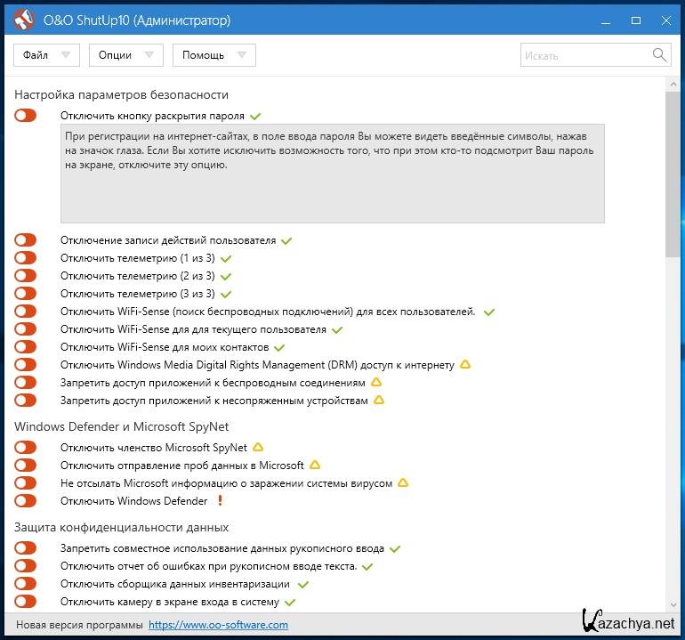 O&O ShutUp10 - предотвращает отправление информации с вашего ПК третьим лицам. Пользователь сможет сам решить какие функции Windows 10 отключить, а какие оставить по соображениям сохранения конфиденциальности данных. Благодаря простому и интуитивному интерфейсу, вы сможете сами решить, какие "полезные" функции нужно отключить для улучшения условий конфиденциальности данных.